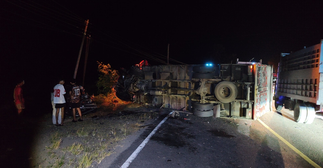 Benturan keras menyebabkan bagian depan kedua kendaraan ringsek parah. Minibus terseret hingga keluar bahu jalan, sementara truk kontainer terguling di tengah badan jalan. Posisi truk yang melintang ini sempat membuat arus lalu lintas di jalur utama Trans Sulawesi terhambat total selama beberapa saat.