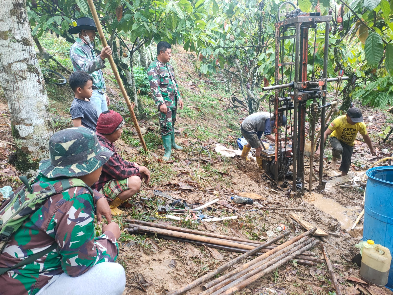 “Alhamdulillah hari ini kita sudah kerjakan satu titik sumur bor dengan kedalaman 17 meter. Sudah ada tanda-tanda menemukan mata air tanah,” ujar Kapten Inf Ahmad Yani saat meninjau lokasi pengeboran.