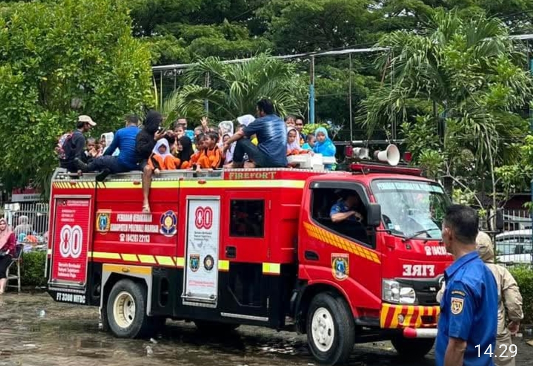 Petugas pemadam kebakaran memberikan edukasi langsung kepada anak-anak tentang pengenalan alat pemadam api ringan (APAR) dan cara memadamkan api kecil, hingga teknik penyelamatan diri jika terjadi kebakaran.