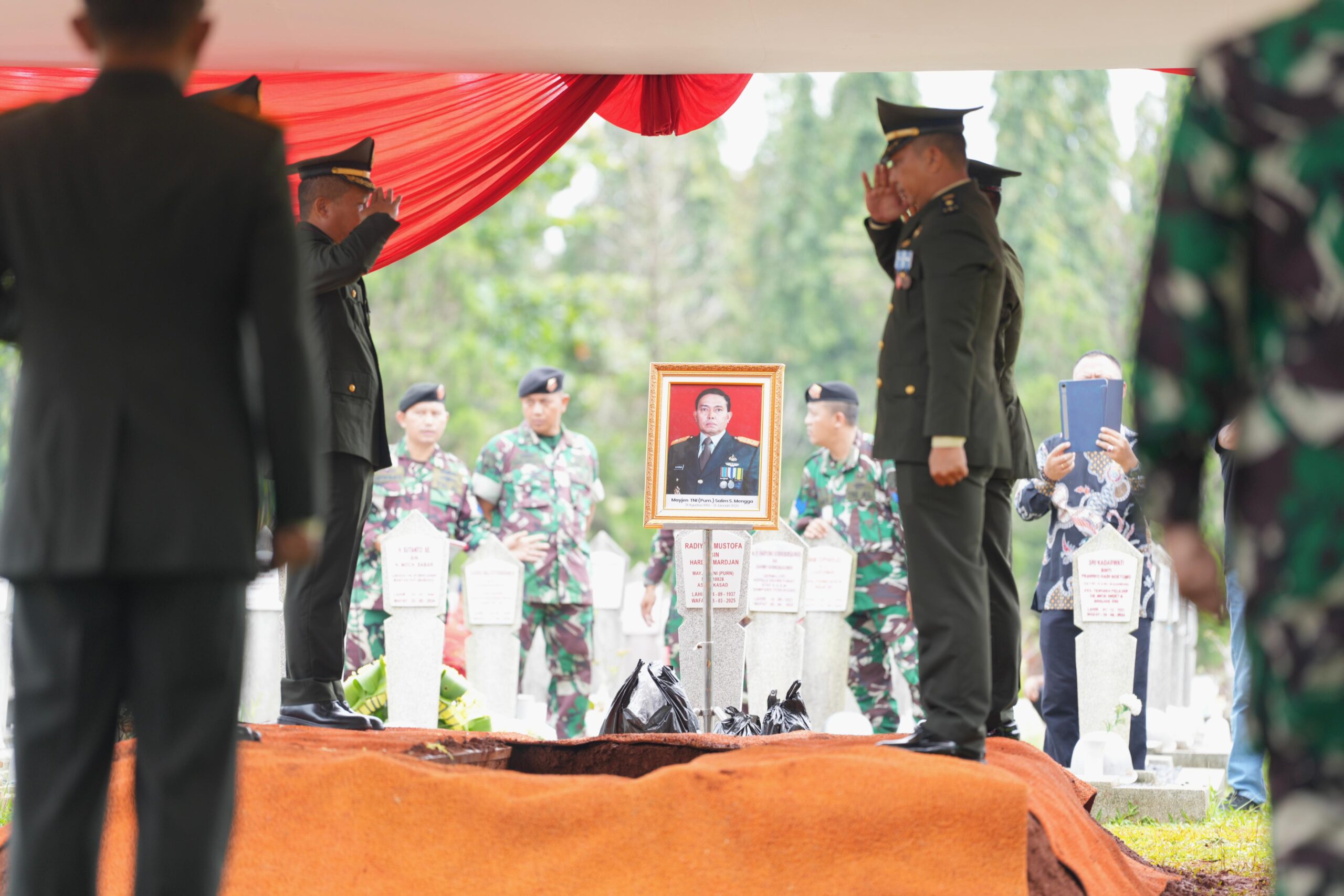 Upacara dimulai dengan prosesi penyerahan jenazah dari pihak keluarga kepada negara. Dentuman tembakan salto mengiringi penurunan peti jenazah ke liang lahat, menandai penghormatan tertinggi bagi purnawirawan jenderal berbintang dua tersebut.