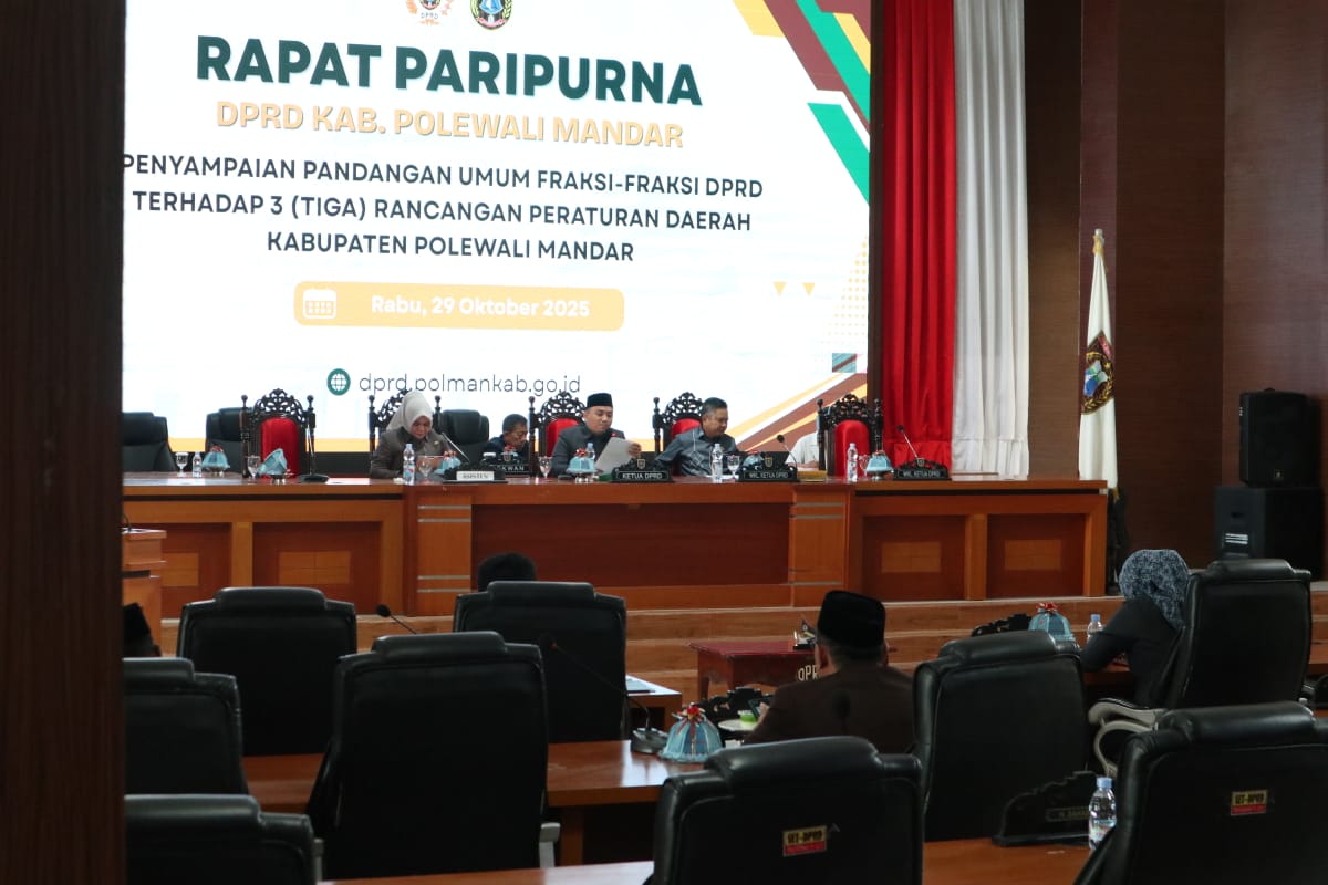 Ruang Redaksi – Dewan Perwakilan Rakyat Daerah (DPRD) Kabupaten Polewali Mandar, gelar Rapat Paripurna dalam rangka Penyampaian Pandangan Umum Fraksi-fraksi DPRD terhadap 3 (Tiga) Rancangan Peraturan Daerah (Ranperda) Kabupaten Polewali Mandar. Rabu, (29/10/2025).
