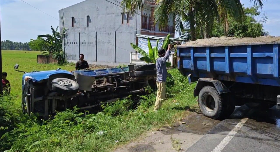 Sopir mobil truk kaget dan kehilangan kendali saat berusaha menghindari sebuah mobil minibus Grand Max hingga akhirnya mobil tersebut terjun ke parit.